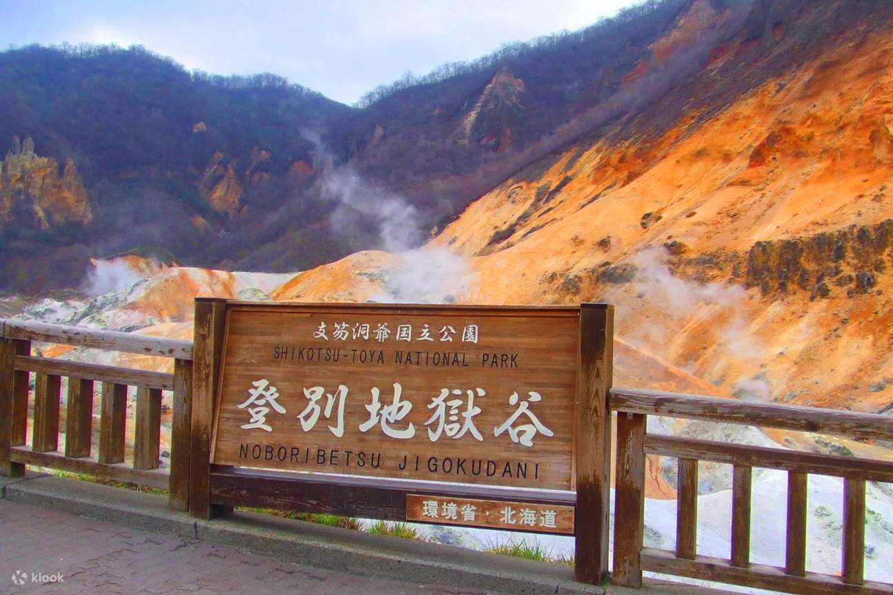 【登別地獄谷】位於登別溫泉街的東北側,是約1萬年前發生的笠山爆發所形成的噴火口,溫泉的出水量每分鐘高達3000立方公升,為登別最大的泉源,依地點不同,湧出之源泉水質亦不相同,可達11種之多。