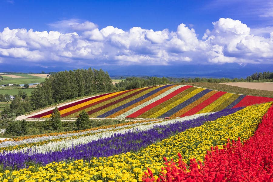 【 四季彩之丘】位於視野遼闊、風景絕佳的“丘之町美瑛”,面積達15公頃,非常廣闊,種植著各式各樣的花朵作物,形成有如拼布一般色彩斑斕的夢幻美景,是美瑛最具代表性的象徵。欣賞鮮豔花海的同時,還能眺望遠峰壯闊的十勝岳山脈,景色令人難忘。