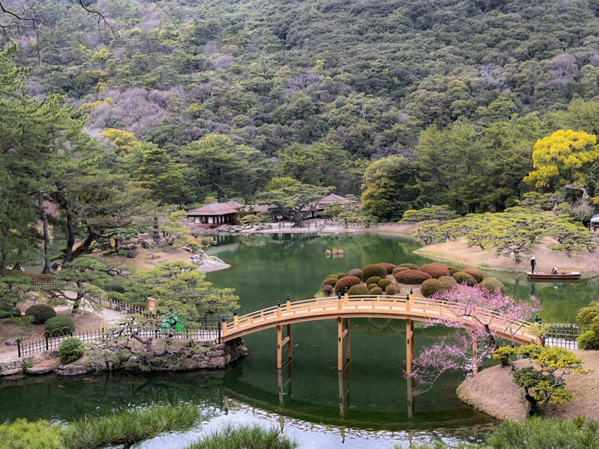 【栗林公園】是日本四國地區最著名的庭院,號稱一步一景,分為南、北兩個庭園,南庭為迴遊式庭園,是全日本被指定為特別名勝的庭園之中最大。栗林公園以翠綠的紫雲山為背景,由6個水池、13座假山以及10多個亭閣巧妙的佈局而成,整個庭園