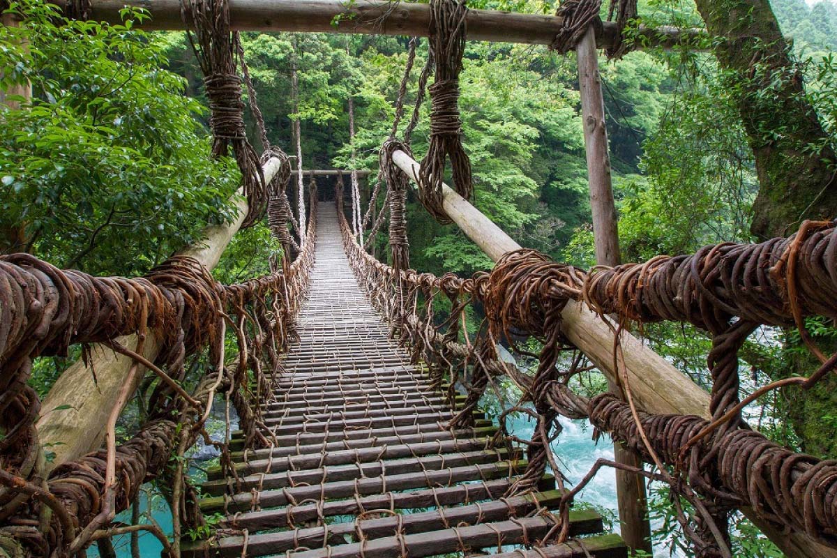 【祖谷溪吊橋】蔓藤橋是從秘境奧祖谷中長出來藤蔓編織而成的橋,為日本三大奇橋之一。據說是800年前,由當地最大勢力的平家為訓練馬匹所架設。