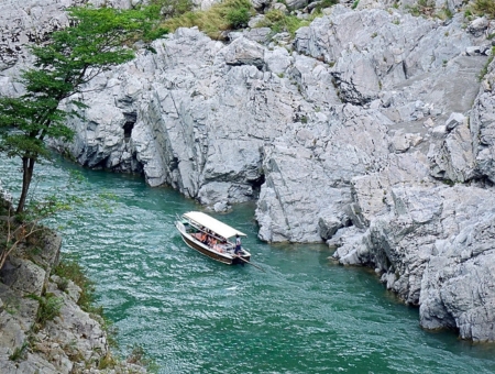 【大步危溪谷遊船】在搭乘遊船的 30 分鐘航程中,可以欣賞德島大步危峽谷的壯麗風光。上船之後可以脫掉鞋子,悠閒地坐在榻榻米上順流而下,有充分的時間可以欣賞碧綠的湖水及兩岸聳立的岩壁。由大步危峽出發,順流而下可進一步體驗山谷之美,沿途溪谷岩壁交錯,可見識到德島縣天然紀念物~蝙蝠岩、獅子岩等特殊奇景。也被稱為《日本三大祕境》之一。