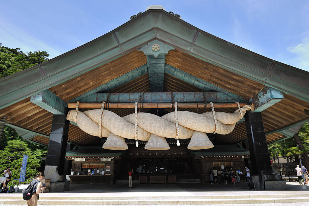 【出雲大社】已有八百年歷史,佔地18萬平方公尺,以「結緣之神」和「福神」而香火鼎盛。出雲大社的建築風格為日本古老的神殿建築樣式,以祭祀大國主命之本殿的神樂殿為中心,其側拜殿並立,四處散發出神聖的氛圍,卻又有一種讓人意外的寬闊舒適之感。
